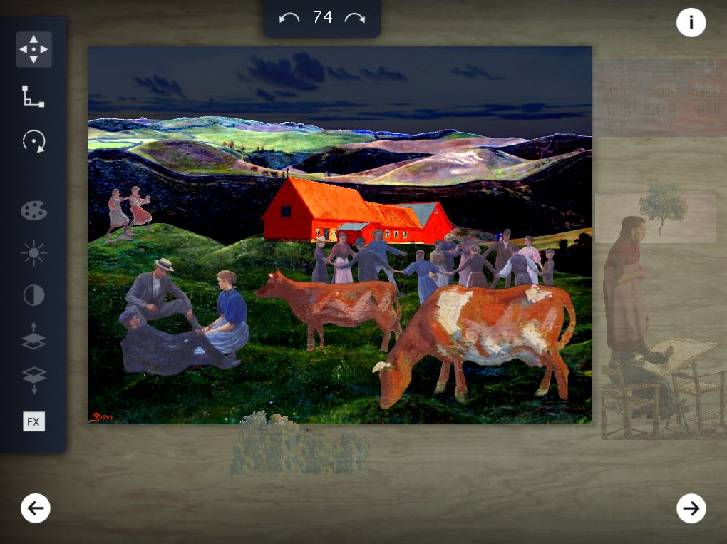 In this app you can be an artist and experience what happens when you paint a painting. Play with perspective, move the ocean up into the sky, paint the cows blue and remove the trees from the wood. In ARTMix we turn up the colours, mix the figures and turns everything upside down. In ARTmix you can experiment with famous art from the Johannes Larsen Museum, Faaborg Museum og BRANDTS. The App’en has been created as a cooperation between: Faaborg Museum, Johannes Larsen Museet, Ungdomshuset Odense og BRANDTS. ARTMix is developed and produced in cooperation between Die Asta Experience, PortaPlay and Søren Robert Lund Arkitekter, app-programming by Kanako.