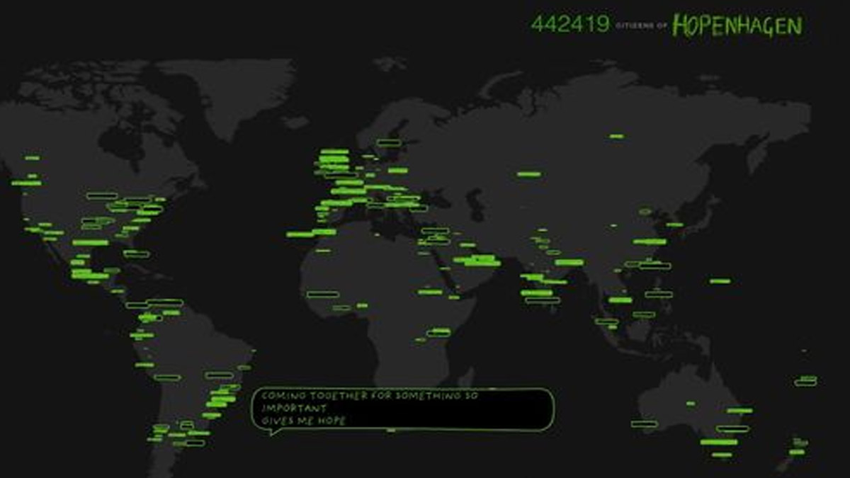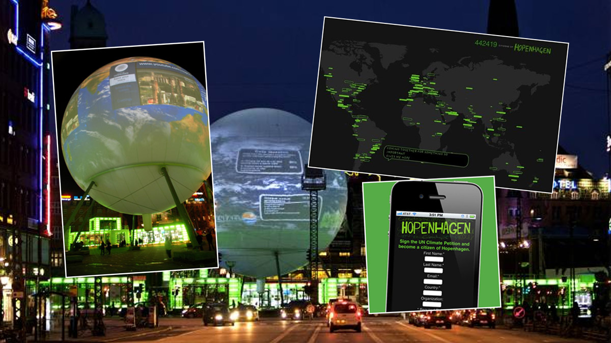 The Globe represents all the climate summits civilian spectators, who could participate in the virtual, interactive demonstration on the Globe, in order to make the politicians agree on a solution. Here the daily program, your voice, SMS- and video messages could be seen live on the Globe, and be experienced by visitors in Copenhagen, as well as be streamed to the whole world, by various NGO homepages.